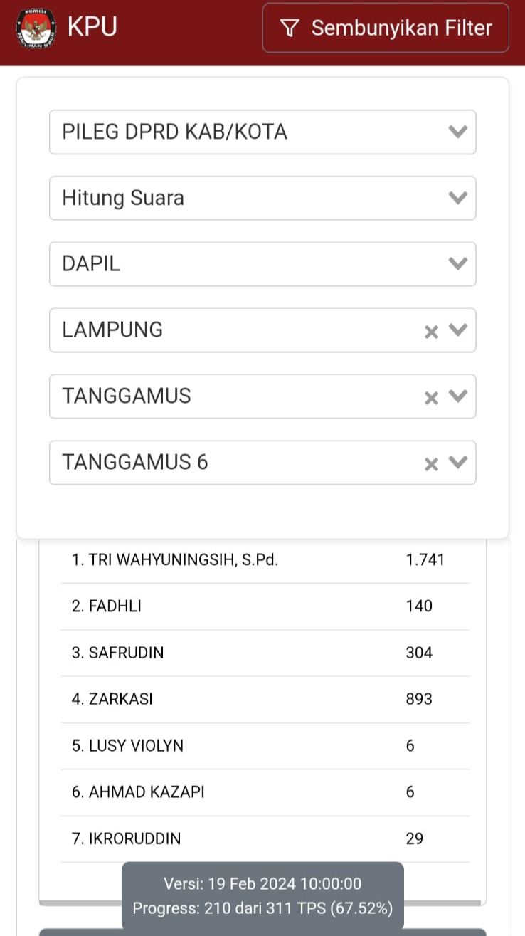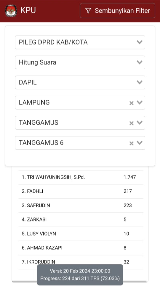 Siber24jam.com – Link real count Komisi Pemilihan Umum (KPU) Kabupaten Tanggamus terdata Senin tanggal 18 Februari dengan jumlah suara 893. Namun, pada tanggal 21, hanya tersisa 5 suara. Perubahan ini terjadi di daerah pemilihan (Dapil) 6 Partai NasDem, nomor urut 4, termasuk Zarkasi salah satu caleg yang perubahannya sangat mencolok.