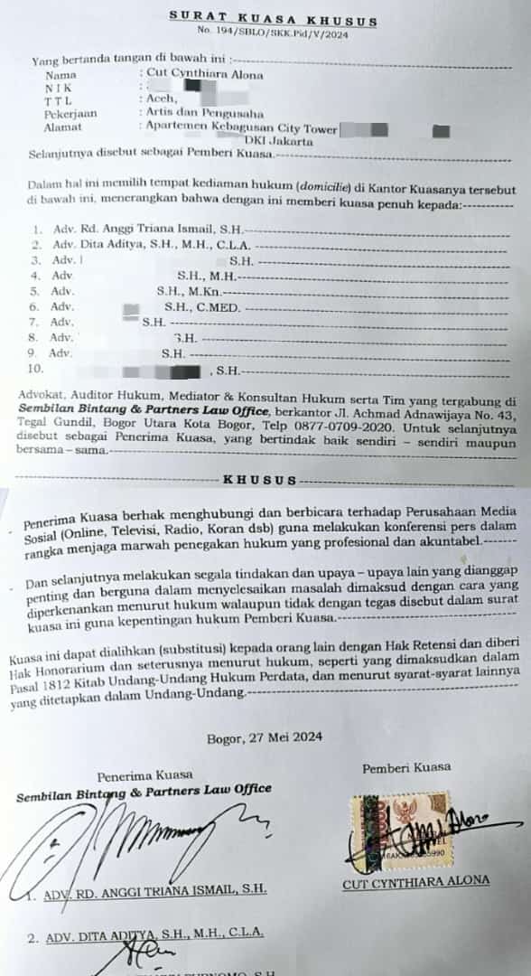 Akhirnya pada tanggal 28 Mei 2024, cut cynthiara alona memohin bantuan hukum dengan mendatangi Kantor Hukum Sembilan Bintang & Partners. Cut cynthiara alona menyampaikan seluruh kronologi dan harapannya terkait kasus yang tengah dihadapinya. Adv. Rd. Anggi Triana Ismail, S.H., selaku Managing Director Sembilan Bintang menyampaikan bahwa benar CCA (39) telah menyambangi kantor kami dan meminta tolong sebagaimana pencari keadilan pada umumnya untuk mengawal serta memperjuangkan kasusnya. Kami sudah mendapatkan beberapa data & fakta hukum yang sekarang kita kantongi. Pelakunya sejauh ini dari hasil informasi yang kami dapatkan diduga seseorang yang berprofesi Advokat, dan kami harus meneliti beberapa keterangan CCA dan data yang kita pegang saat ini, untuk menentukan langkah hukum lanjutan. CCA pada pertengahan tahun 2022 telah membuat 2 laporan kepolisian di Kepolisian Daerah Metro Jaya atas dugaan tindak pidana penipuan / penggelapan / pencurian / pemalsuan / permufakatan jahat dan deelneming sebagaimana yang dimaksud dalam UU No. 73 Tahun 1958 tentang Menyatakan Berlakunya Undang-Undang No. 1 Tahun 1946 Republik Indonesia Tentang Peraturan Hukum Pidana Untuk Seluruh Wilayah Republik Indonesia Dan Mengubah Kitab Undang-Undang Hukum Pidana.