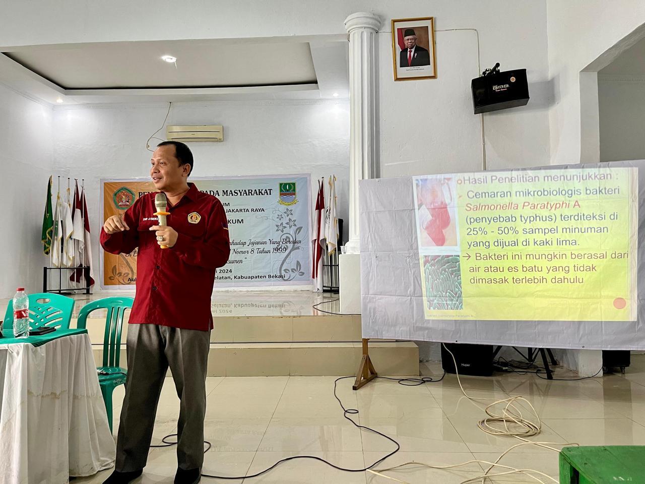 Kegiatan pengabdian masyarakat sekaligus acara penutupan KKN dihadiri oleh 2 narasumber yaitu Dr. Noviriska, S.H., M.Hum dan Bapak Dr. Dwi Atmoko, S.H., M.H. Hadir juga Kepala Desa Bapak H. Suryadi, S.H., Sekretaris Desa Bapak Jahidin, Staff Desa, RT RW Desa Setiamekar, serta warga Desa Setiamekar. Dalam kegiatan tersebut, Dosen Pembimbing Lapangan Kuliah Kerja Nyata (KKN) Kelompok 5 Universitas Bhayangkara Jakarta Raya sekaligus narasumber pengabdian masyarakat, Ibu Dr. Noviriska, S.H., M.Hum mengatakan bahwa banyak sekali permasalahan keracunan anak akibat jajanan di sekolah. Makanan yang mengandung zat-zat berbahaya atau yang sudah tercemar secara kimia akan memberi dampak sangat fatal bagi tubuh, terutama jika dikonsumsi dalam jangka waktu lama dan jumlah besar. Masuknya zat kimia dapat menyebabkan gangguan pencernaan, gangguan fungsi organ dalam seperti hati, jantung, paru-paru, bahkan bisa menyebabkan kematian.