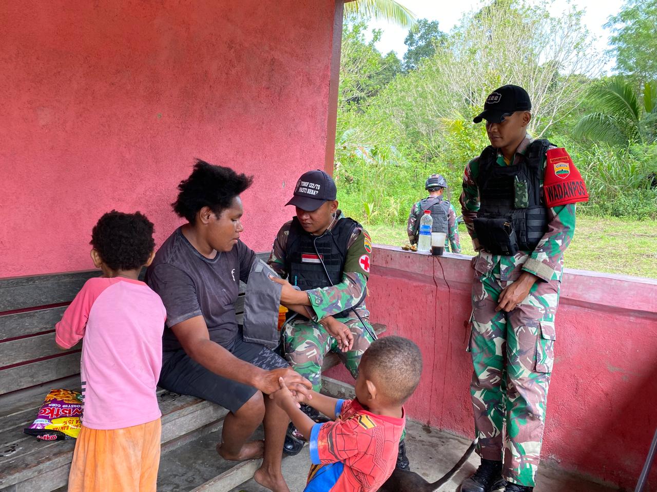 Kegiatan pelayanan kesehatan yang dipimpin oleh Sertu Fikri Febrian berserta 10 orang anggota yang di laksanakan di kampung kalibom mendatangi kerumah – rumah warga dan menanyakan kesehatan warga perbatasan.