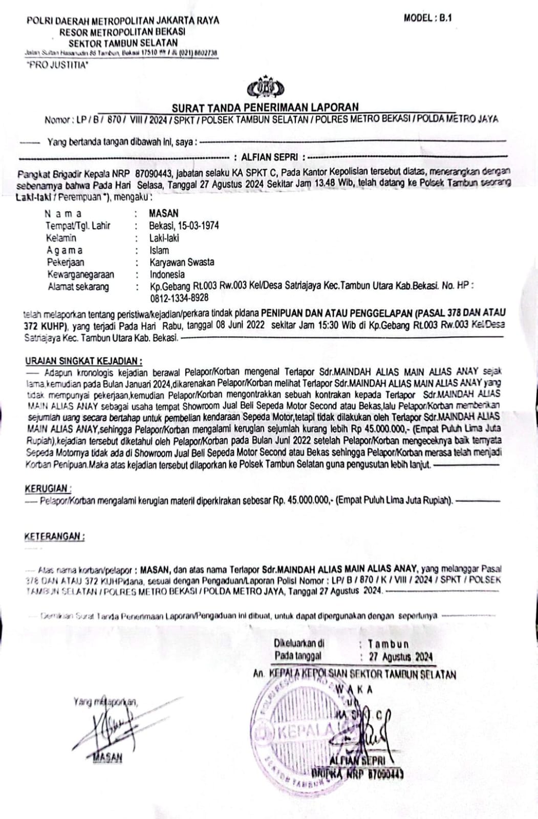 Bekasi, Siber24jam.com – 27 Agustus 2024. Polsek Tambun saat ini sedang menangani kasus dugaan penipuan dan penggelapan yang dilaporkan di Sentra Pelayanan Kepolisian Terpadu (SPKT) dengan Nomor: LP / B / 870 / VIII / 2024 / SPKT / POLSEK TAMBUN SELATAN. Pelaku, yang berinisial M, diduga melakukan tindakan penipuan dan penggelapan yang merugikan pihak korban. Kasus ini mencuat setelah korban melaporkan adanya transaksi yang dianggap tidak sesuai dengan apa yang dijanjikan oleh pelaku.