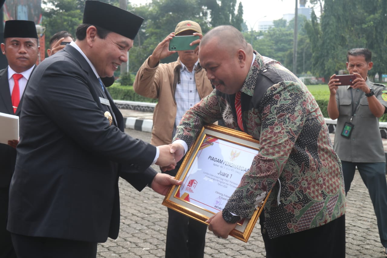 CIBINONG, Siber24jam.com – Pemerintah Kabupaten (Pemkab) Bogor menggelar Upacara Peringatan Hari Pahlawan ke-79 tingkat Kabupaten Bogor yang dipimpin langsung oleh Pj. Bupati Bogor, Bachril Bakri, di Lapangan Tegar Beriman pada Minggu (10/11/24). Upacara berlangsung khidmat diikuti oleh berbagai elemen, mulai dari Aparatur Sipil Negara (ASN), Forum Koordinasi Pimpinan Daerah (Forkopimda), pelajar, veteran, hingga tokoh masyarakat. Selain upacara, dilaksanakan juga penyerahan penghargaan bagi pemenang lomba kreatif 2023, pemberian bantuan renovasi kamar kepada veteran, serta bantuan sembako.
