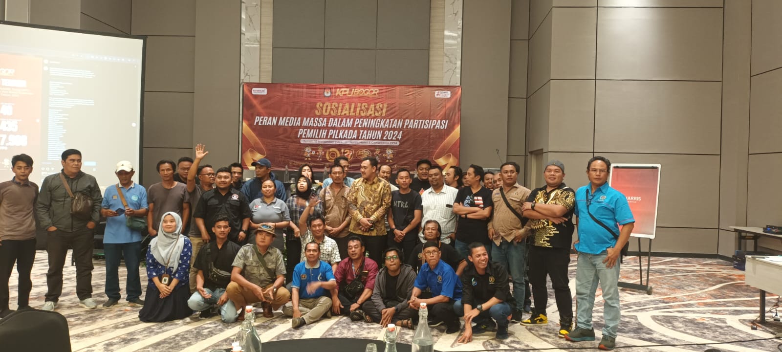 Siber24jam.com Kabupaten Bogor — Menyongsong Pilkada 2024 yang akan dilaksanakan pada 27 November, Komisi Pemilihan Umum (KPU) Kabupaten Bogor menggelar sosialisasi bertema “Peran Media Massa dalam Meningkatkan Partisipasi Pemilih pada Pilkada 2024.” Acara berlangsung di Hotel Harris, Cibinong, Jumat (15/11/2024), dan dihadiri berbagai perwakilan organisasi media, termasuk Persatuan Wartawan Indonesia (PWI), Ikatan Jurnalis Televisi Indonesia (IJTI), serta sejumlah insan pers.