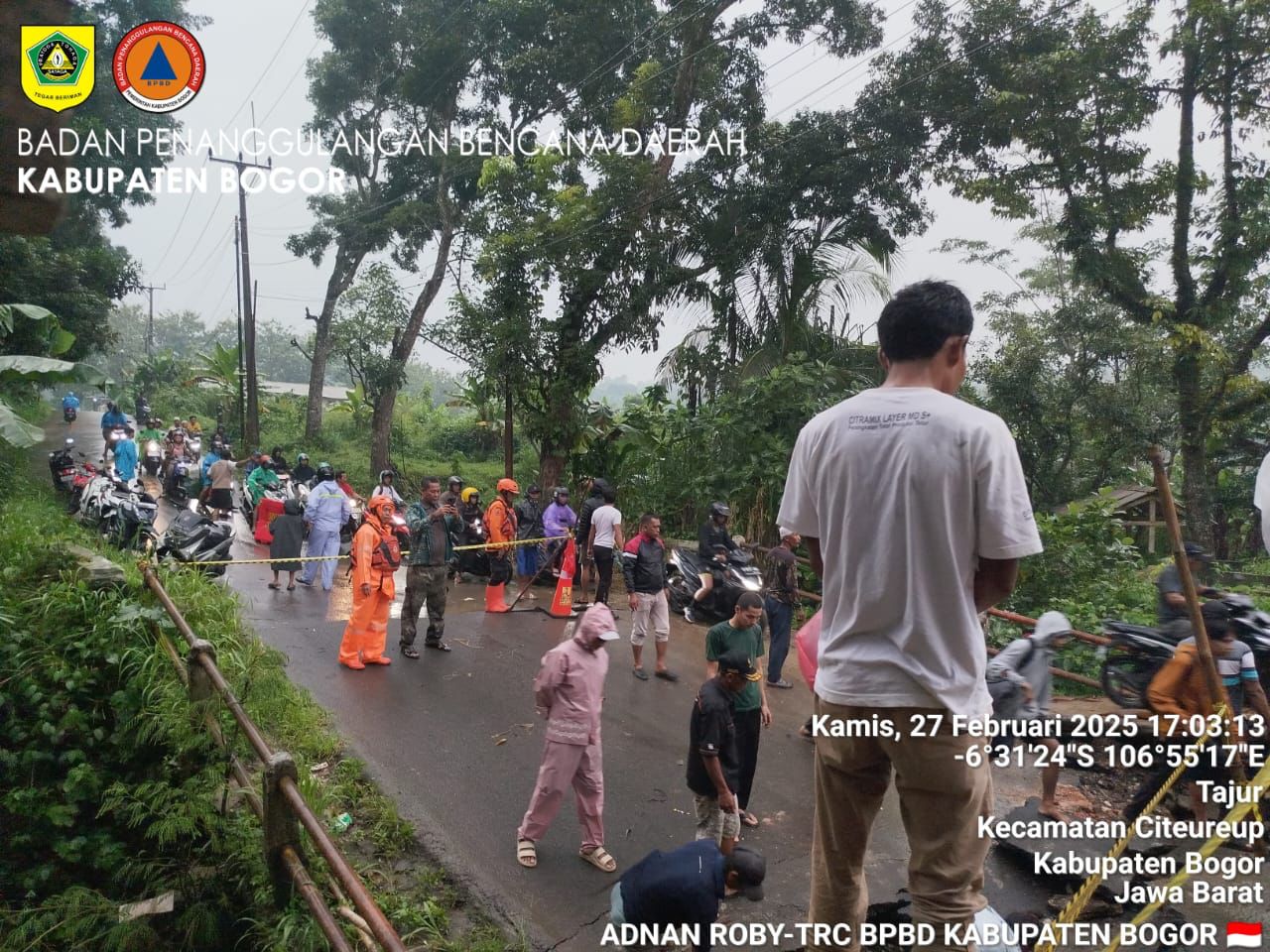 Kepala Bidang Kedaruratan dan Logistik BPBD Kabupaten Bogor, M. Adam Hamdani, mengungkapkan bahwa tim BPBD telah bergerak cepat ke lokasi untuk mengamankan area dan melakukan asesmen awal. Selain itu, tim reaksi cepat BPBD juga memasang danger line guna mencegah warga melintas di jalur yang berbahaya.