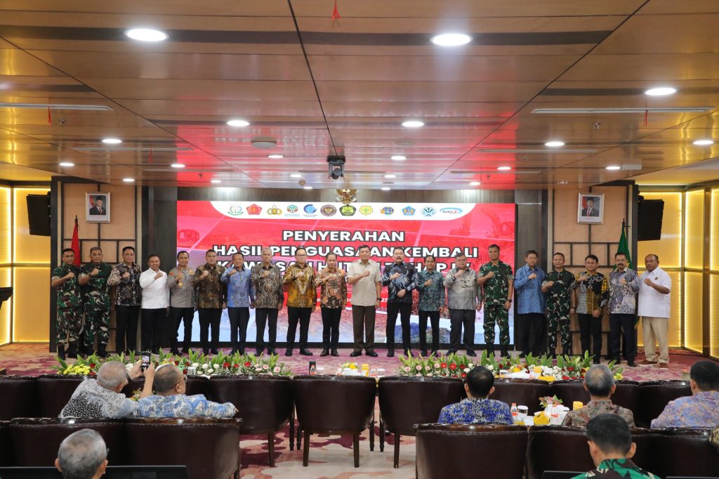 Rapat penyerahan penguasaan kembali lahan digelar di Gedung Utama Kejaksaan Agung dan dihadiri oleh Menteri Pertahanan Sjafrie Sjamsoeddin, Menteri Kehutanan Raja Juli Antoni, Menteri Lingkungan Hidup Hanif Faisol Nurofiq, serta pejabat penting lainnya dari berbagai instansi terkait.